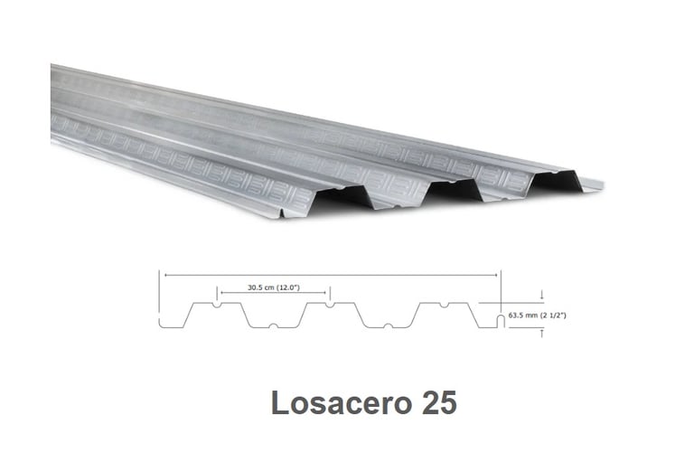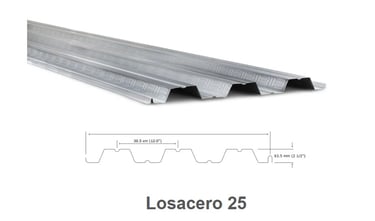 Nuestra Losacero sección 25 es una solución estructural de alta calidad, fabricada bajo las normas ASTM A653 y SS37. Su acabado galvanizado le brinda una excelente protección contra la corrosión, haciéndola un material de larga vida útil y bajo mantenimiento.